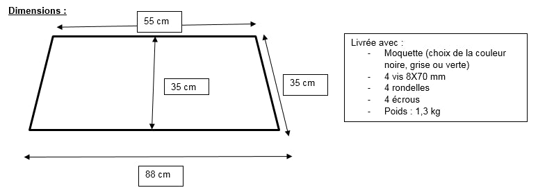 Dimensions plate forme : largeur avant : 550 mm ; largeur arrière : 880 mm ; Longueur : 350 mm ; épaisseur : 20 mm ; poids : 1.3kg.