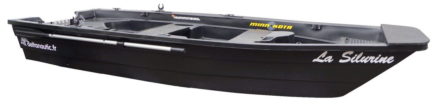 Barque Silurine 4m double coque en polyéthylène haute densité imputrescible et sans entretien. Coque monobloc sans soudure et autovideuse à l'arrêt. Homologuée normes CE catégorie D. Traitement anti UVs. Idéale pour tout type d'utilisation : pêche (brochet, sandre, silure), chasse, promenade.