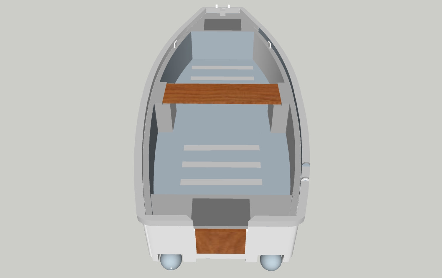 Fabrication 100% française. Coque monobloc sans soudure en polyéthylène haute densité, traité anti UVs, imputrescible, sans entretien. Barque double coque autovideuse à l'arrêt, forme catamaran pour parfaite stabilité. Fond plat rainuré.