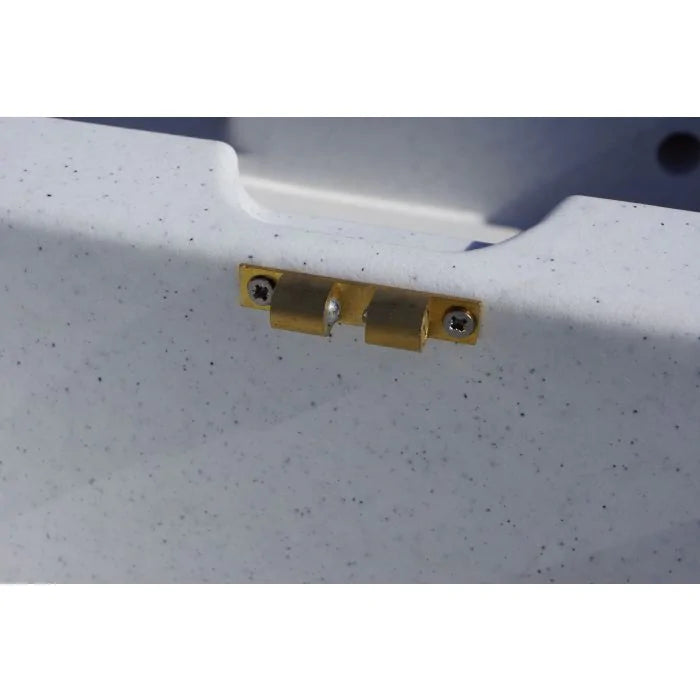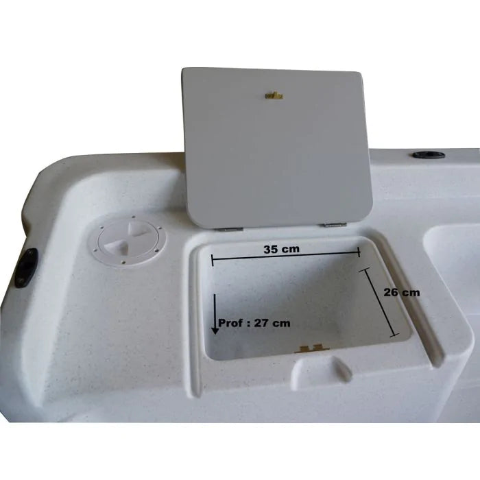 Fabrication 100% française. Barque étravée pour une excellente pénétration dans l'eau. Fond intérieur plat et rainuré pour une excellente stabilité. Double coque autovideuse à l'arrêt en polyéthylène haute densité, teinté dans la masse, traité anti UVs, imputrescible et sans entretien. Coffres en starboard (marque déposée) : matériau d'une qualité remarquable, résistant aux UVs, imputrescible, recyclable, importé des USA, et d'une résistance inégalée. Système d'ouverture des coffres étanches par charnières d'une très haute qualité et verrouillage en laiton. Charnières, visserie et boulonnerie en inox. Cette barque de pêche et de promenade haut de gamme est garantie dans toute la France 3 ans.
