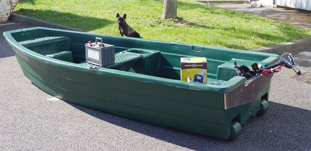 La barque Spacieuse 3m20 + 1 moteur électrique Eco Booster V 55 Lbs 12V + 1 batterie marine décharge lente 125Ah 12V + 1 chargeur de batterie (Modèles d'exposition) :