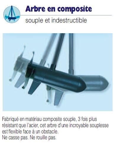 Ce modèle de moteur électrique est manipulable d'une seule main (système One Hand Stow) pour pouvoir manoeuvrer facilement tout en poursuivant une action de pêche. Sa poignée est télescopique (20cm) et pivotante en hauteur sur 45°. Le réglage de la hauteur de l'arbre est aisé grâce au système de blocage exclusif. Le moteur est fourni avec une hélice power prop, une jauge de batterie intégrée, un étrier de tableau serrage à vis et un arbre en matériau composite souple, robuste, à l'abri de la rouille, 3 fois plus résistant que l'acier et flexible face à un obstacle.
