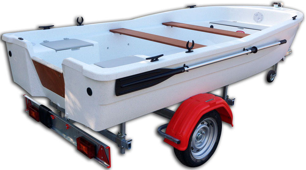 Remorque complète équipée de roues 450 x 10 : pour tout type de barque jusqu'à 4.40m. Châssis, essieu galvanisé à chaud et réglable. Boule diamètre 50. Circuit 12V. Suspension à éléments de caoutchouc compressés. Plaque de signalisation amovible. Garde-boue en polyéthylène. Livrée avec treuil, une roue jockey télescopique de 48, butée d'étrave, potence, 4 anneaux de sanglages, 3 diabolos sur le timon avant dont 1 diabolo d'attaque afin de faciliter la remontée de la barque. Fabrication française et garantie nationale 3 ans.