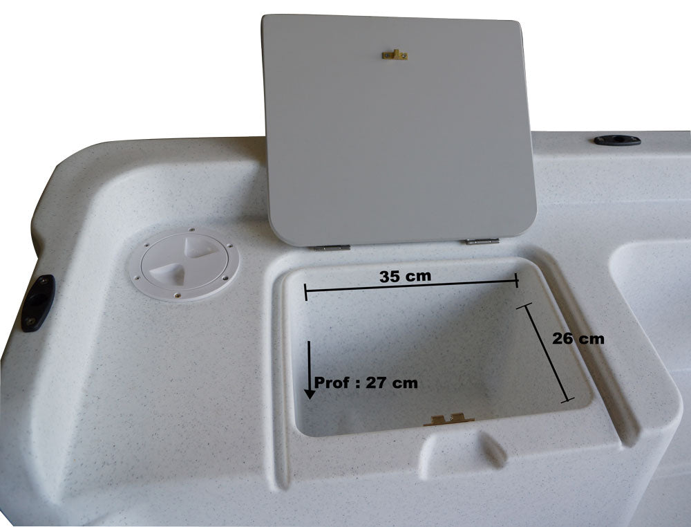 Fabrication 100% française. Coque de la barque étravée pour une excellente pénétration dans l'eau. Pas de clapot ni aucun roulis en action de pêche. Fond intérieur plat et rainuré pour une excellente stabilité. Double coque autovideuse à l'arrêt en polyéthylène haute densité, teinté dans la masse, traité anti UV, imputrescible et sans entretien. Coffres en starboard (marque déposée) : matériau d'une qualité remarquable, résistant aux UV, imputrescible, recyclable, importé des USA, et d'une résistance inégalée. Système d'ouverture des coffres étanches par charnières d'une très haute qualité et verrouillage en laiton. Charnières, visserie et boulonnerie en inox. Cette barque de pêche et de promenade haut de gamme est garantie dans toute la France 5 ans.