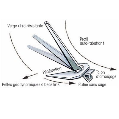La Britany est la seule ancre plate sans cage d'articulation, d'où aucun risque de blocage de verge dû au bourrage, et une prise instantanée. Construite en acier galvanisé très haute résistance (55 kg d'acier par mm2).